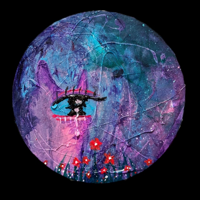 ・サイズ:直径20cmの丸キャンバス ・画材:キャンバス、アクリル絵の具、修正液、ペン、色鉛筆、ノリ ・制作年数:2024年