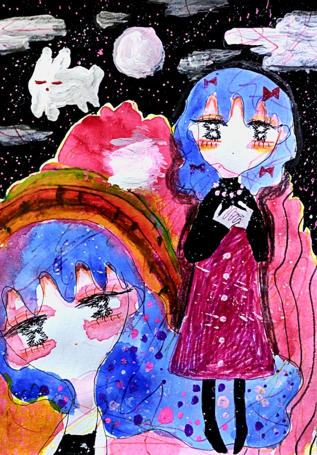 ・サイズ:A6(148×100mm) ・画材:紙、アクリル絵の具、修正液、ペン、色鉛筆 ・制作年数:2024年