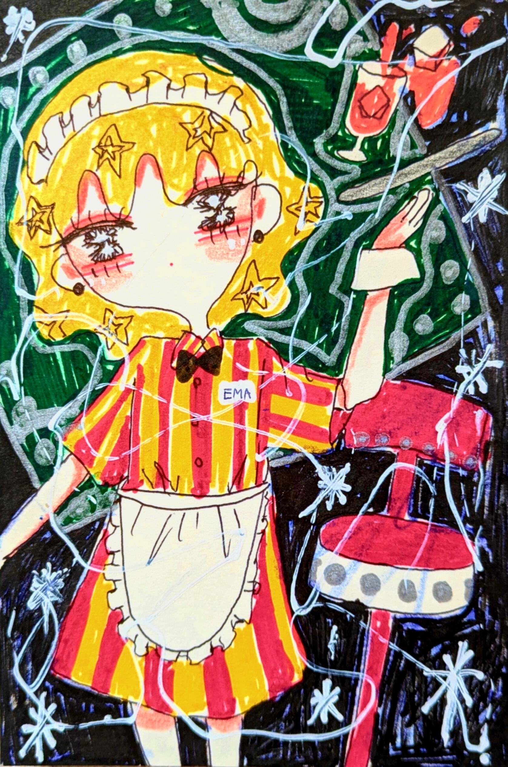 ・画材:紙、アクリル絵の具、修正液、ペン、色鉛筆